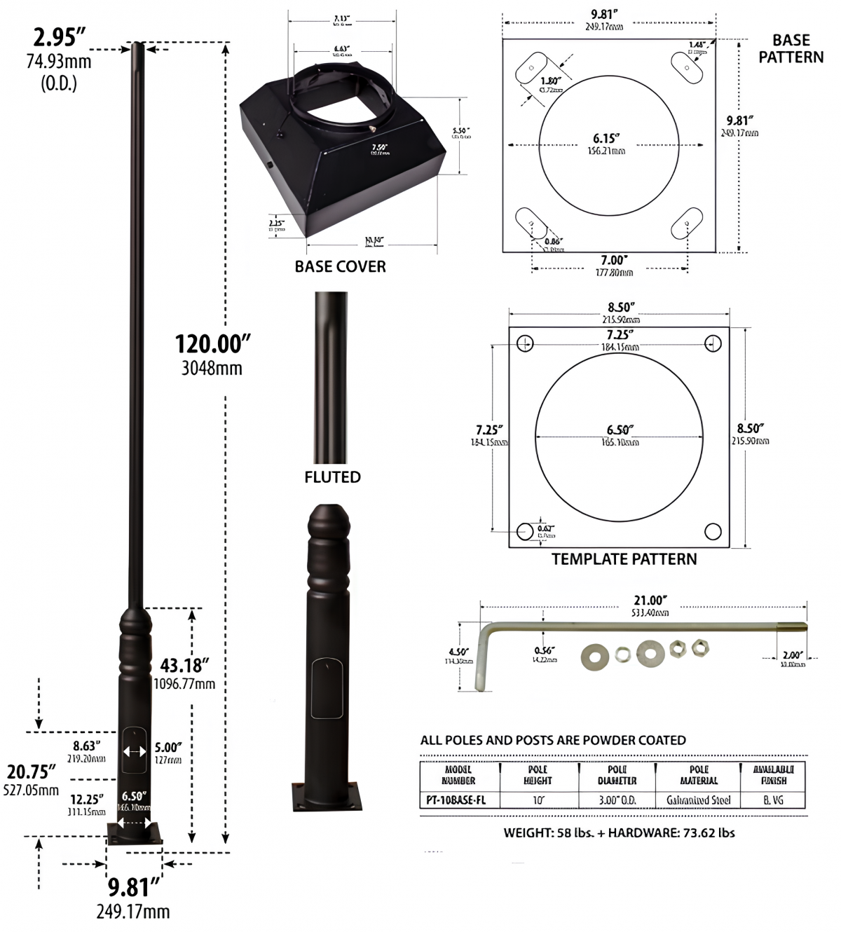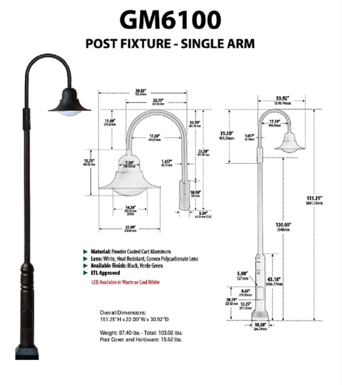 Material: Powder-coated cast aluminum fixture. Powder coated galvanized steel post.